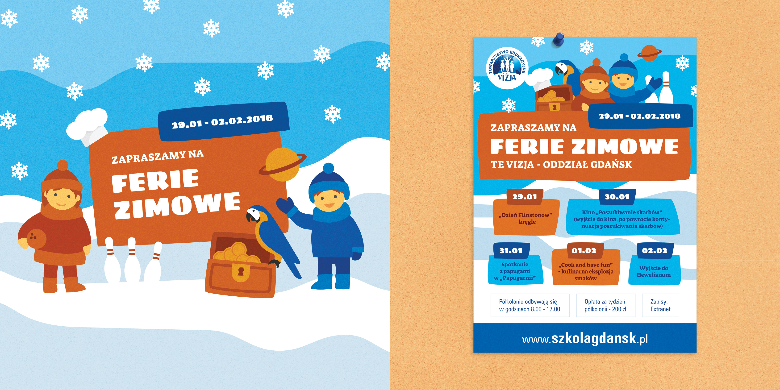 Plakat i grafika na stronę - Ferie zimowe 2018 dla Towarzystwa Edukacyjnego Vizja, format A3, 2018